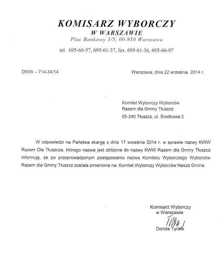 Pamiętacie Państwo dyskusję na temat zbliżonych nazw komitetów wyborczych? Okazało się, że KWW „Razem Dla Tłuszcza” po skardze KWW „Razem dla Gminy Tłuszcz” musiał zmienić swą nazwę.