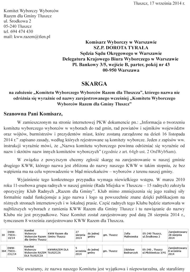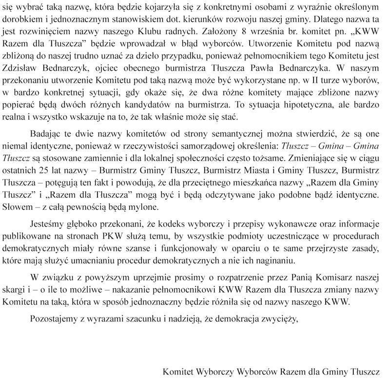 Okazuje się, że głos radnego Szydlika nie był odosobniony i jego zdanie podzielili członkowie KWW „Razem dla Gminy Tłuszcz”. Złożyli u Komisarza Wyborczego skargę o poniższej treści: